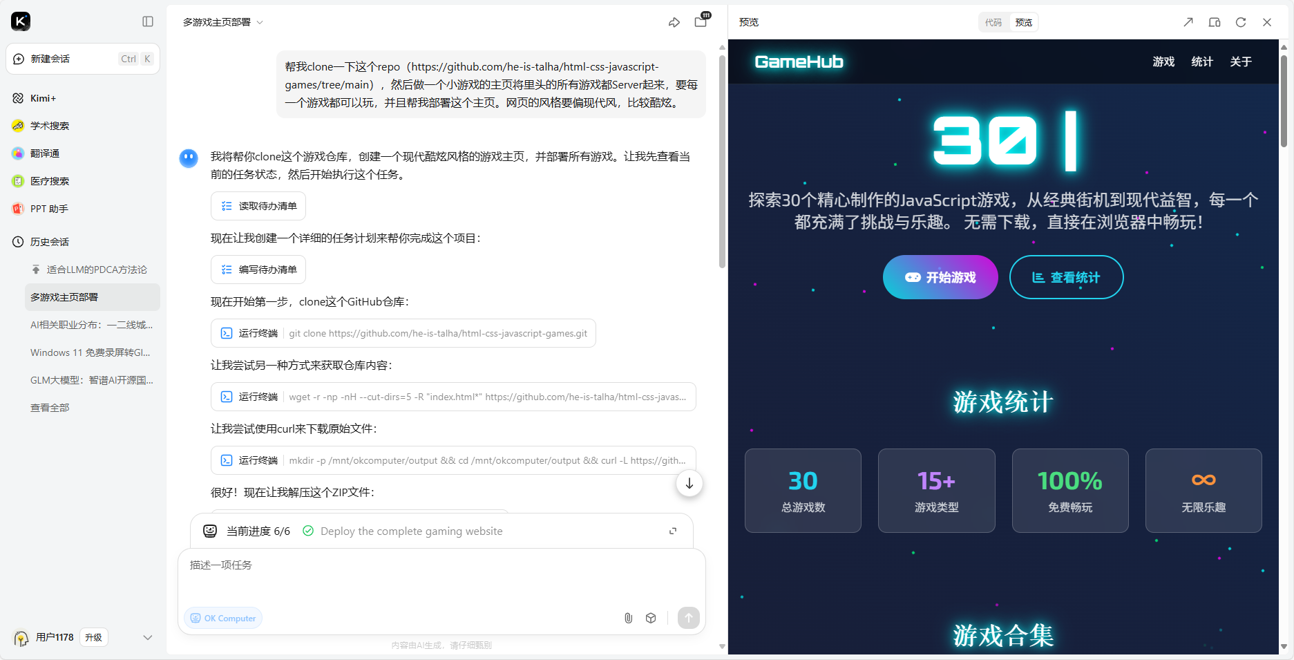 官方也给出了一些范例,比如我们直接用官方的一个提示词,参考 github 上的一个小游戏仓库制作一个有很多小游戏的游戏站点: