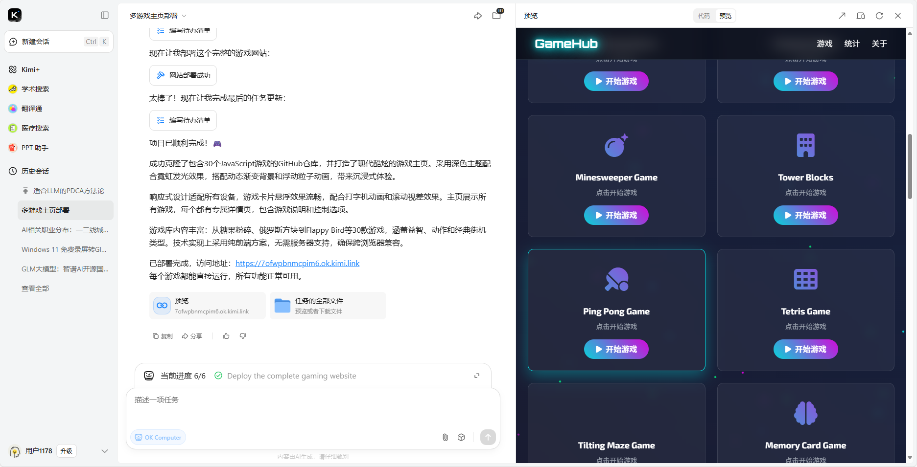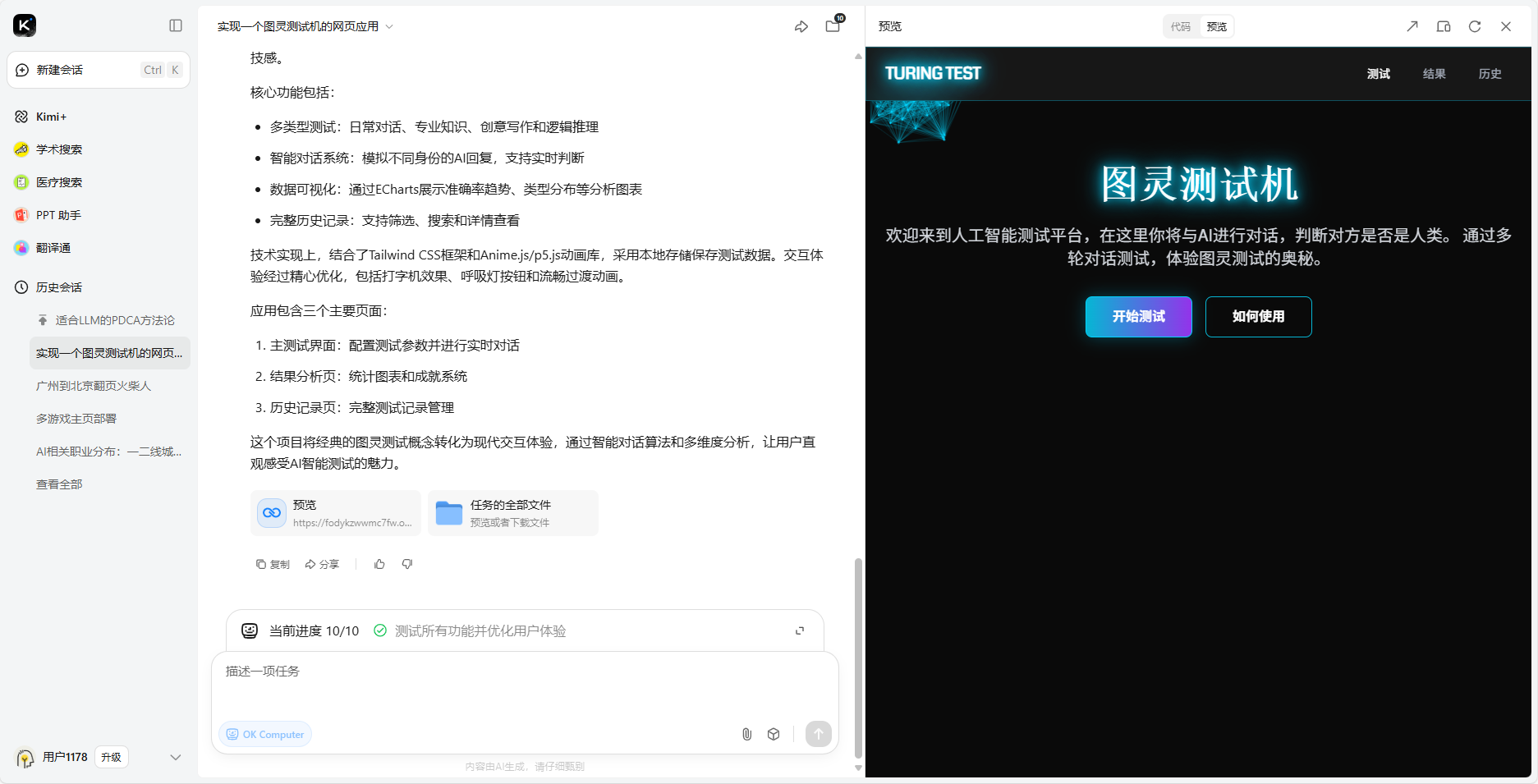 有了「OK Computer」,即使你不会写代码,也可以做出一个多功能的网站原型。Kimi 会像产品经理和工程师一样思考,不只是写代码,而是深入理解业务需求,规划结构与流程,一步一步实现你的 Web 应用原型。Kimi 甚至可以帮你直接把网站部署到云端,方便你把自己的作品链接分享给好友。